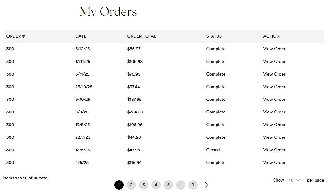 If you click an order number you can view the details of the order including the items, shipping and billing addresses, print a copy of your invoice and track your order.